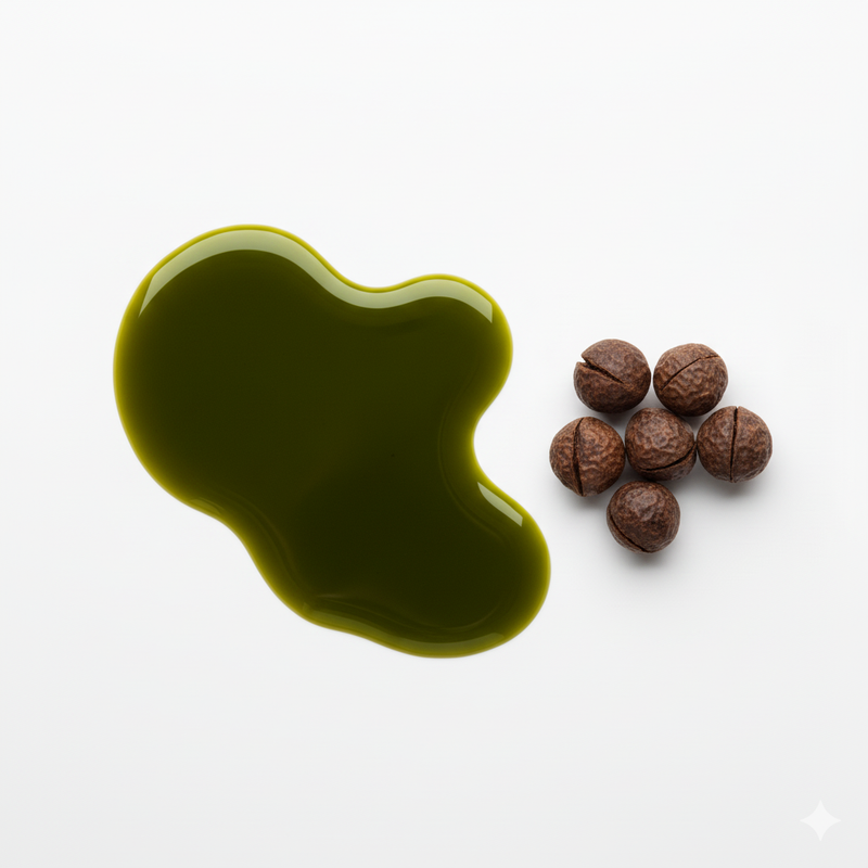 Tamanu oil is a deep green to olive-brown oil with a fairly thick, slightly viscous texture. Its aroma is nutty and wood-like rather than floral or fresh. On application it spreads more slowly than lightweight oils, giving a noticeable protective film which afterwards absorbs into skin leaving a soft, slightly weighty (not sticky) finish.